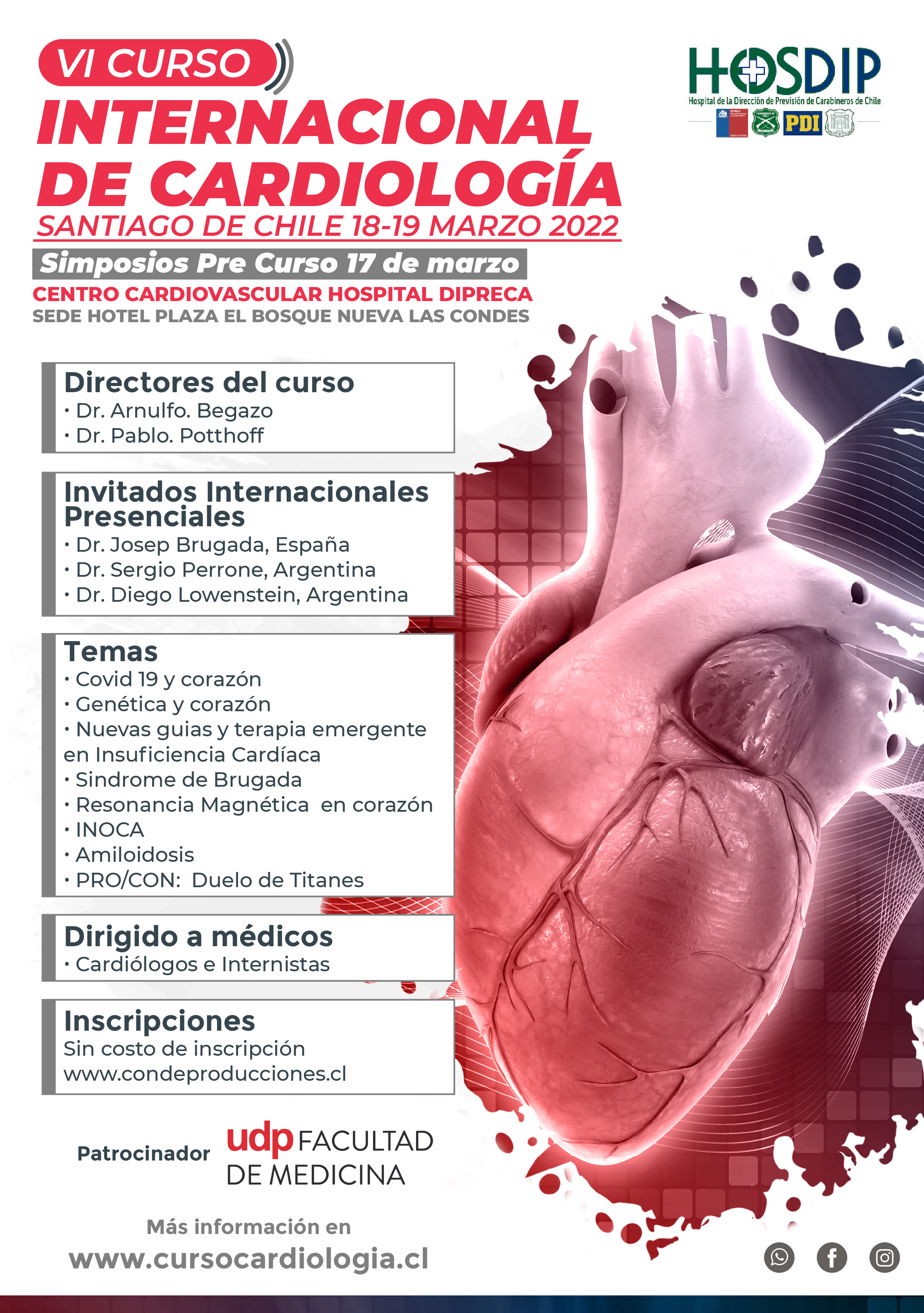 Este viernes 18 y sábado 19 se realizará el VI Curso Internacional de Cardiología, actividad que es organizada por el Centro Cardiovascular del Hospital Dipreca y patrocinada por la Facultad de Medicina UDP.